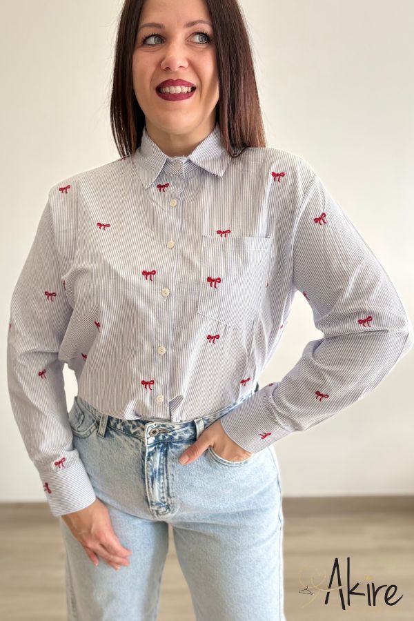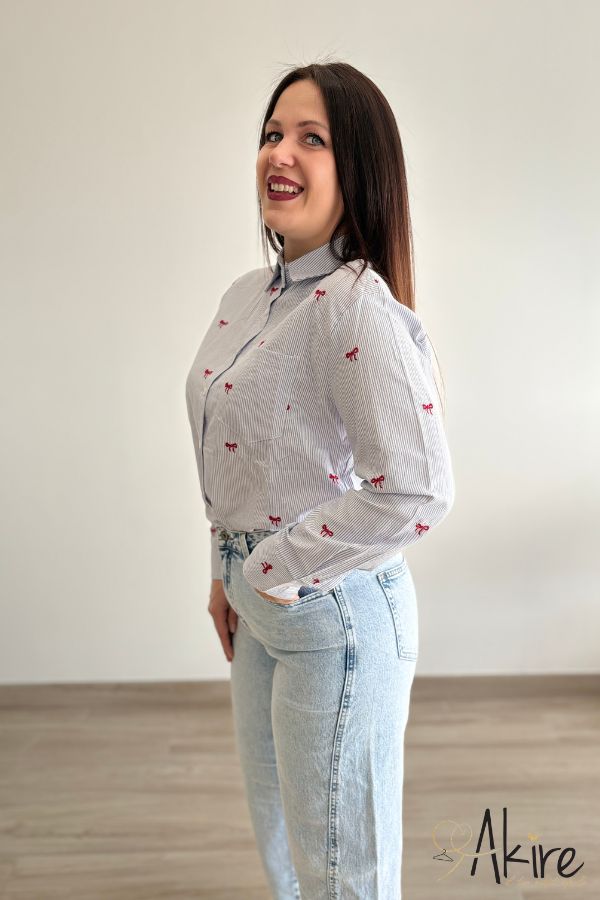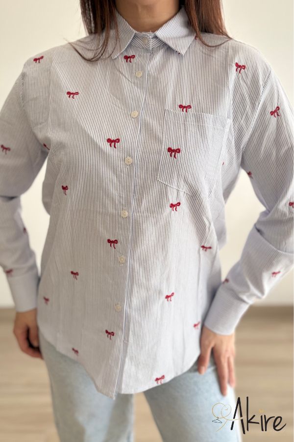 Camicia azzurra e bianca a righe sottili, con delicati fiocchetti rossi.