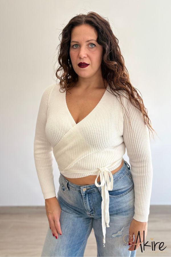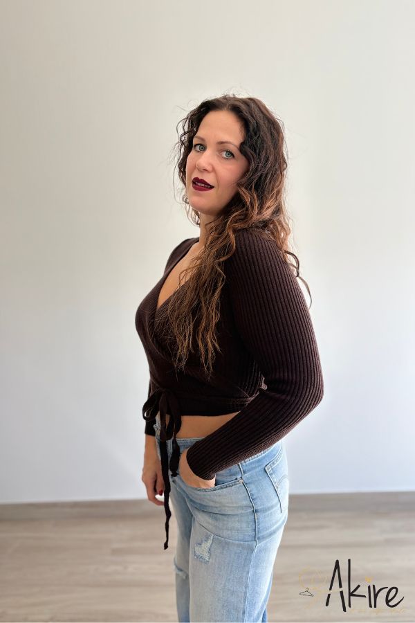 Maglia elasticizzata, modello corto. Presenta laccetti per chiuderla in vita. Misto viscosa.