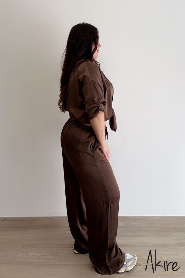 Pantalone a vita alta linea palazzo con coulisse in vita. Presenta laccetto regolabile. Tessuto morbido al tatto.